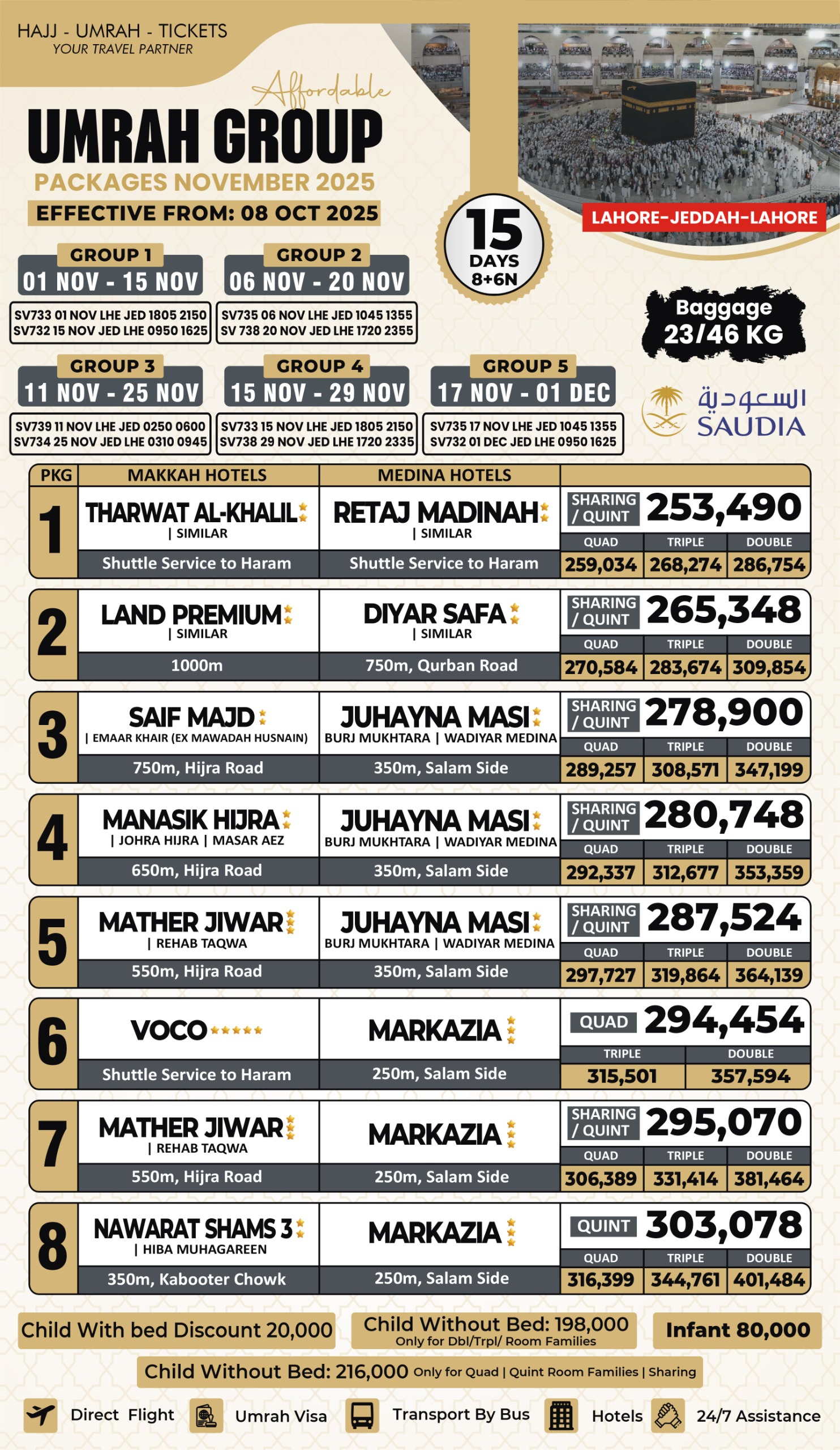15 Days & 21 Days Umrah Group Package With Tickets Exe Lahore.