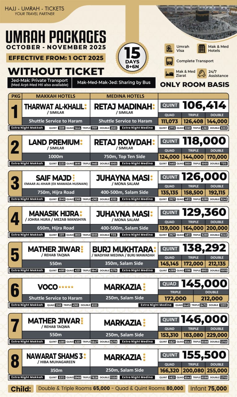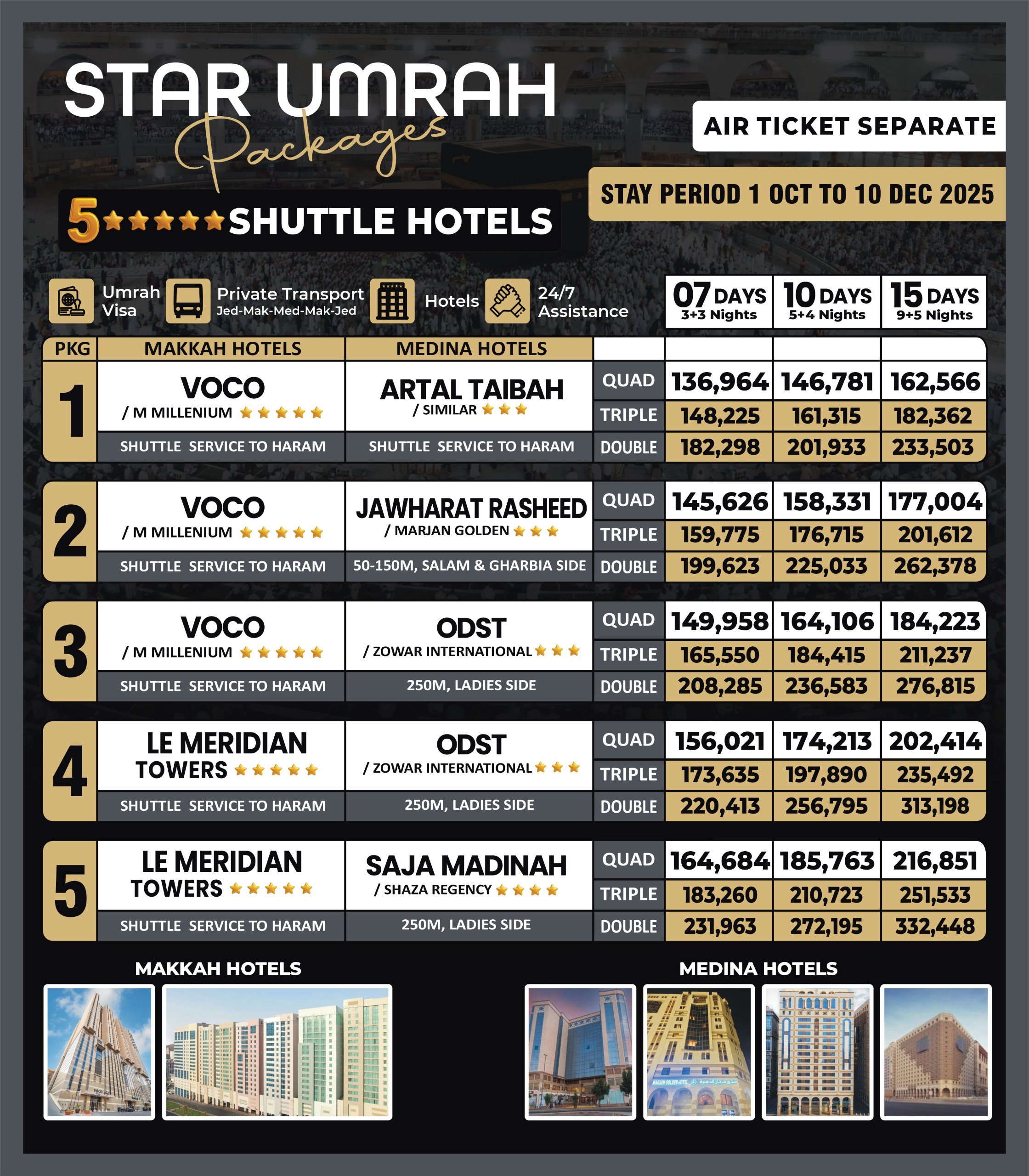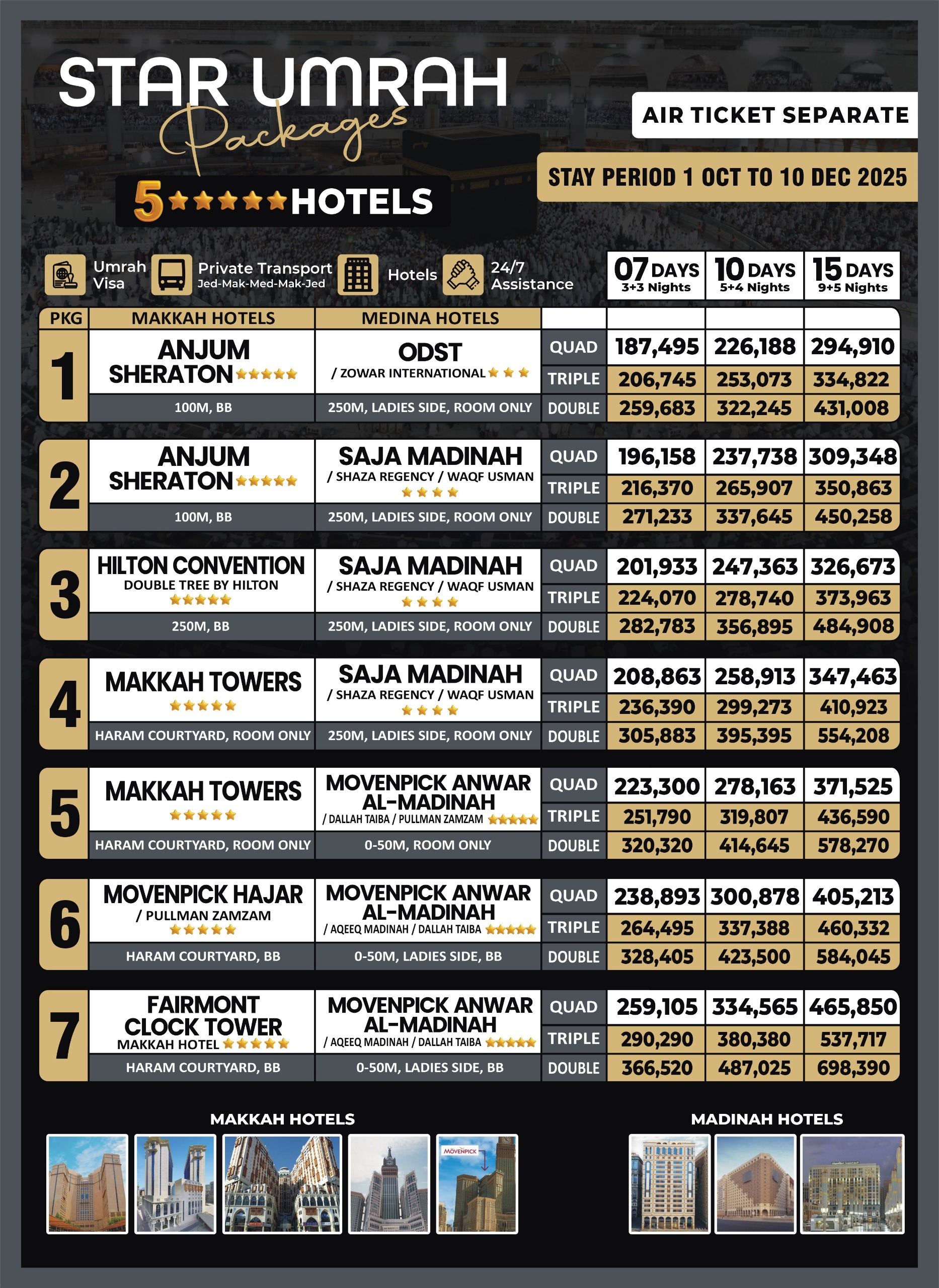 Star Umrah Package 07 Days, 10 Days ,15 Days Package